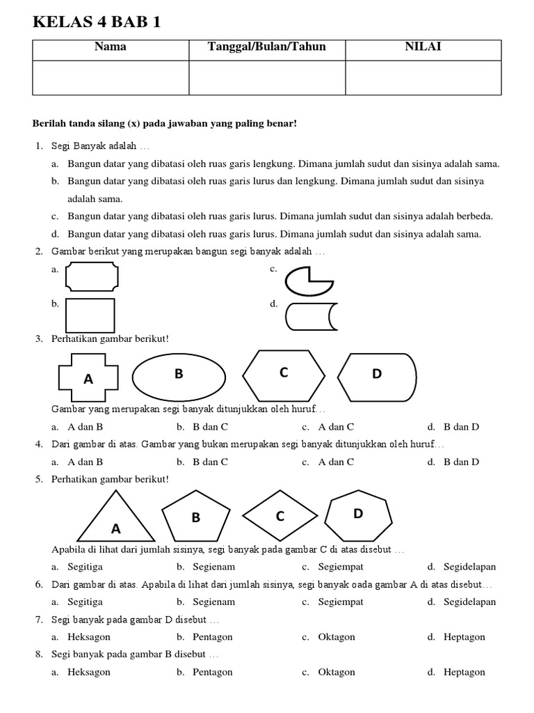 Soal Ulangan Harian Matematika Bangun Segi Banyak Kelas 4 Sd Diary Guru from 1.bp.blogspot.com Maybe you would like to learn more about one of these? Yang bukan merupakan segi banyak adalah. Check spelling or type a new query. We did not find results for: